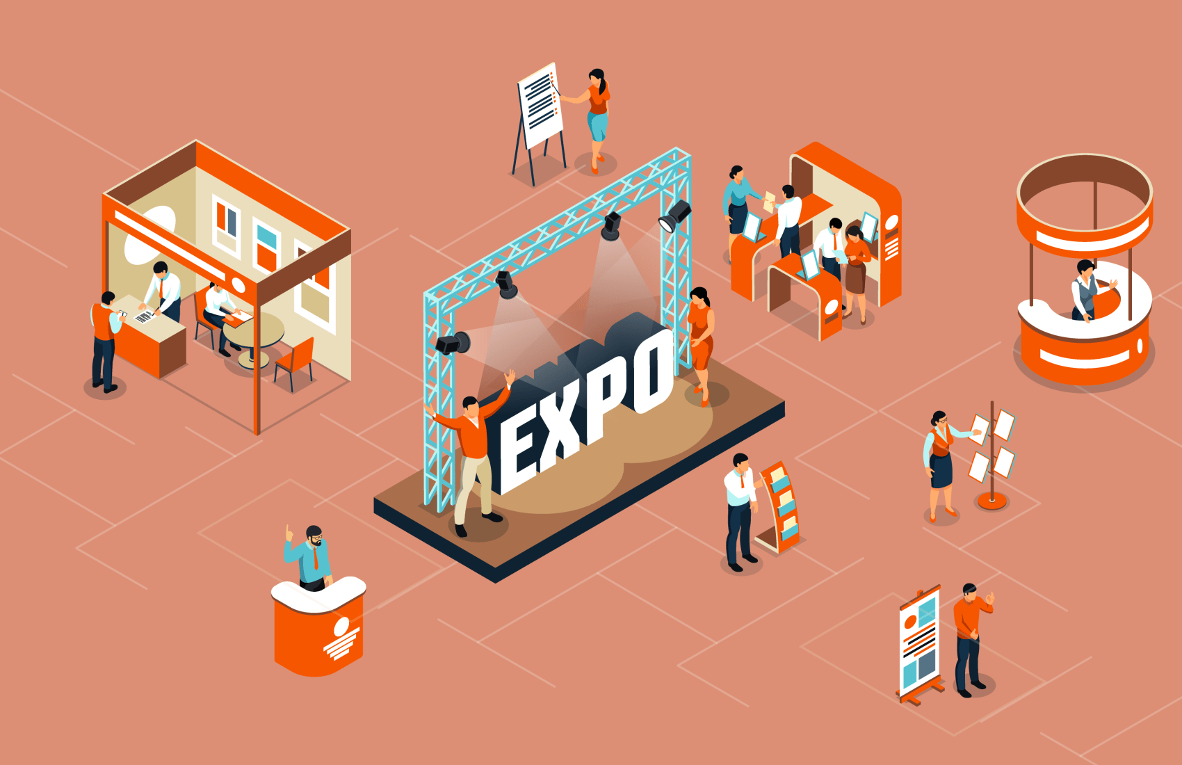 Astuce : Pour en mettre plein la vue aux visiteurs, pensez à choisir des couleurs et des matériaux en lien avec votre thématique. Un événement nature ? Optez pour des matériaux bruts. Un thème futuriste ? Choisissez des surfaces métalliques ou LED.